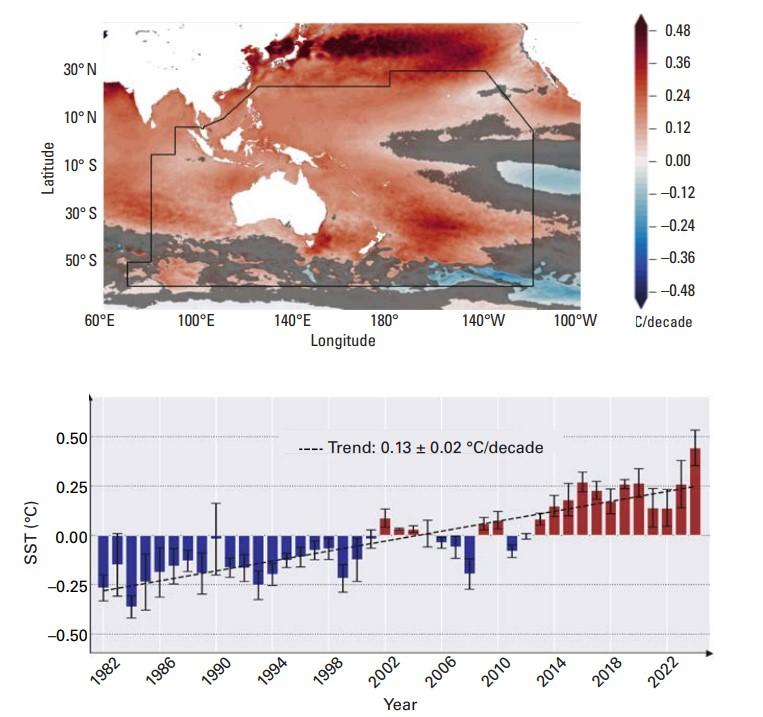 وفي عام 2024، سجَّل المحتوى الحراري للمحيطات في جنوب غرب المحيط الهادئ ثاني أعلى مستوى له بالتساوي مع عامي 2021 و2023 بعد الرقم القياسي المُسجَّل في عام 2022. والمناطق التي شهدت أعلى ارتفاع في درجة حرارة المحيطات على مدى العقود الخمسة الماضية هي بحر تاسمان وبحر سليمان ومعظم المناطق المحيطة بالدول الجزرية الصغيرة في المحيط الهادئ.