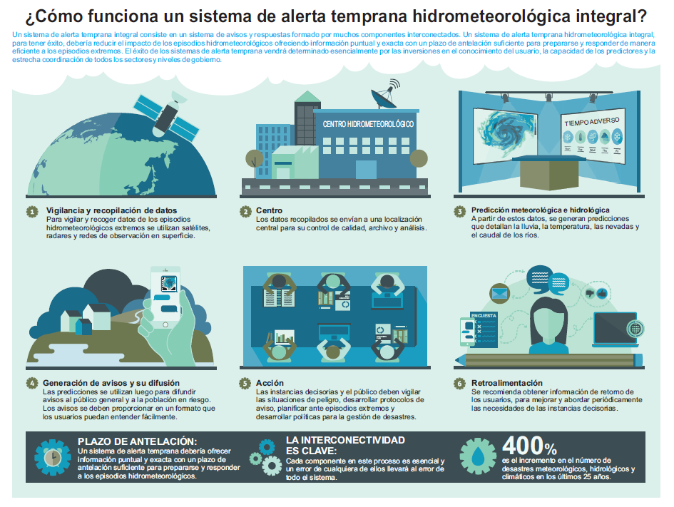 Los fenómenos hidrometeorológicos extremos representan más del 90% de todos los desastres causados por peligros naturales registrados entre 1994 y 2013. Tan solo las crecidas, los temporales, las sequías así como las temperaturas extremas afectaron a más de 3 000 millones de personas, se cobraron alrededor de 600 000 vidas y causaron cerca de 2 billones de dólares de los Estados Unidos de América en daños económicos directos durante el mismo período. Según el Fondo Mundial para la Reducción de los Desastres del Banco Mundial, la evaluación económica de los servicios meteorológicos e hidrológicos indica que se podrían salvar hasta 23 000 vidas y se podrían obtener beneficios económicos por valor de hasta 65 000 millones de dólares si los Servicios Meteorológicos e Hidrológicos Nacionales (SMHN) reforzaran la producción de mejores servicios de predicción, información y aviso.
