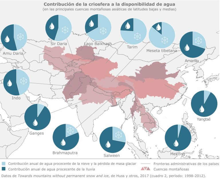 A menudo a los grandes ríos que nacen en las montañas se les llama las “torres de agua del mundo” (Immerzeel y otros, 2020). La criosfera de montaña (glaciares, nieve, permafrost y suelo estacionalmente congelado) juega un papel fundamental en el suministro y la regulación de los recursos de agua dulce para aproximadamente la mitad de la población mundial (Egan y Price, 2017). Esto incluye en particular a quienes viven en zonas densamente pobladas situadas en tierras bajas, como el delta del Ganges-Brahmaputra.