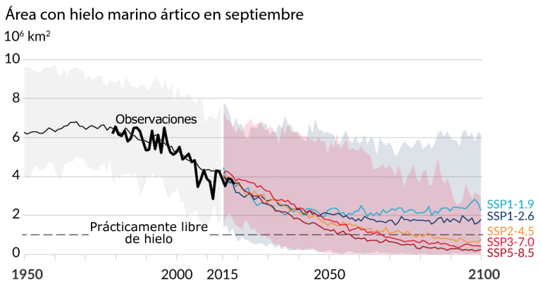 Figura 5. Área con hielo marino ártico en septiembre en una zona de 106 km2 calculada a partir de observaciones satelitales y simulaciones del modelo CMIP6. Se muestran los rangos muy probables para las trayectorias socioeconómicas compartidas (SSP) SSP1-2.6 y SSP3-7.0. Se estima que el Ártico estará prácticamente libre de hielo a mediados de siglo en escenarios de emisiones medias y altas de gases de efecto invernadero. La figura es una adaptación de la figura SMP.8 de IPCC (2021). Las observaciones han sido añadidas por Ed Hawkins (http://www.climate-lab-book.ac.uk/2021/adding-observations/) (Gráfico cortesía de Thomas Lavergne). |