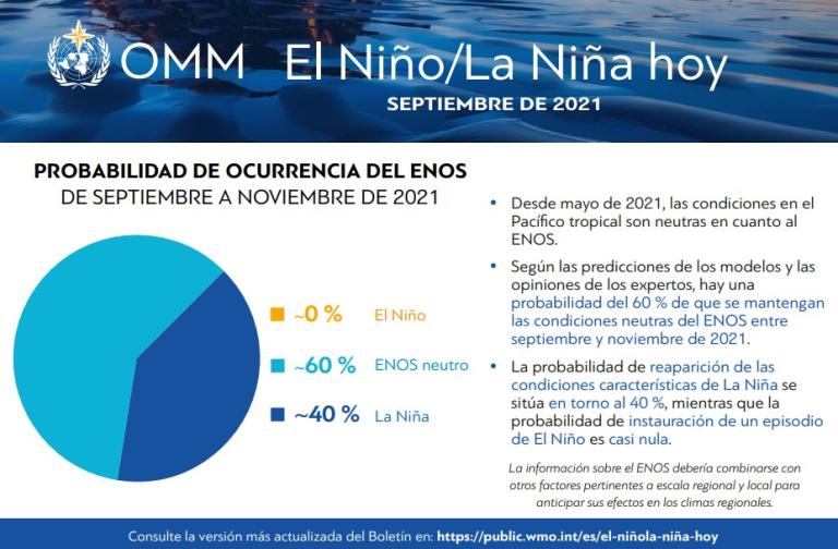 En el boletín El Niño/La Niña Hoy más reciente de la OMM se contemplan dos posibles escenarios: o bien se mantienen unas condiciones neutras con respecto al ENOS, o bien vuelven a instaurarse unas condiciones compatibles con La Niña hacia finales de año. Para el período de septiembre a noviembre, la probabilidad de que se produzcan unas condiciones neutras del ENOS es del 60 %, y la probabilidad de que se instaure un episodio de La Niña es del 40 %; para los períodos de octubre a diciembre y de noviembre a enero, las probabilidades de que se mantengan las condiciones neutras del ENOS y de que se forme un episodio de La Niña son las mismas. De acuerdo con las proyecciones sobre El Niño/La Niña, es probable que en 2022 vuelvan a darse unas condiciones neutras en cuanto al ENOS.