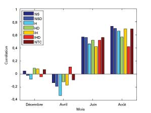 Figure 1 — Corrélations des prévisions saisonnières de l’Université d’État du Colorado dans divers cas: décembre (1992-2006), avril (1995-2006), juin (1984-2006 ou 1990-2006) et août (1984-2006 ou 1990-2006). Ces corrélations sont présentées pour le nombre de tempêtes baptisées (NS), le nombre de jours de tempêtes baptisées (NSD), le nombre d’ouragans (H), le nombre de jours d’ouragans (HD), le nombre d’ouragans majeurs (IH), le nombre de jours d’ouragans majeurs (IHD) et l’activité cyclonique nette (NTC). Les corrélations significatives pour un seuil de signification de 95 % sont NS, NSD, H, HD, IHD et NTC pour juin et NS, NSD, H, HD, IH et NTC pour août. Aucune des corrélations n’est significative dans les cas de décembre et d’avril. |