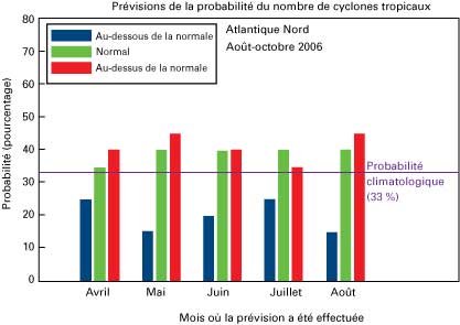 Figure 4 — Probabilité du nombre de cyclones tropicaux dans l’Atlantique d’août à octobre 2006 pour divers délais d’échéance selon les prévisions dynamiques expérimentales de l’IRI. La catégorie normale correspond à six à neuf cyclones tropicaux baptisés, la catégorie inférieure à la normale à cinq ou moins et la catégorie supérieure à la normale à 10 ou plus. D’août à octobre 2006, il y a eu sept cyclones tropicaux baptisés dans l’Atlantique, ce qui correspond à une saison normale. |