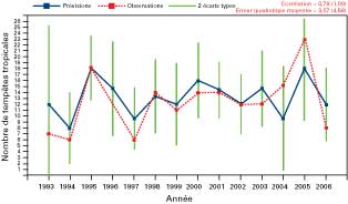 Certains des meilleurs modèles dynamiques ont une qualité de prévision de la fréquence des tempêtes tropicales comparable à celle des modèles statistiques employés pour certains bassins océaniques. Dans le nord et le sud de l’océan Indien, les modèles dynamiques donnent généralement de mauvais résultats (Camargo et al., 2005). On ne sait pas exactement dans quelle mesure cela est dû à des erreurs des modèles ou au manque de prévisibilité. Comme dans le cas des prévisions saisonnières du climat, l’association des prévisions de modèles différents (prévisions d’ensemble multimodèle) produit globalement de meilleures prévisions que les prévisions d’ensemble émanant de chaque modèle (Vitart, 2006). La qualité des simulations rétrospectives réalisées par divers modèles dynamiques du climat pour prévoir l’activité saisonnière des cyclones tropicaux est abordée par Camargo et al. (2005) et par Vitart (2006). Les prévisions dynamiques multimodèle européennes (EUROSIP) de la fréquence des cyclones tropicaux ont permis de distinguer correctement la saison très active des ouragans de 2005 de la saison de 2006, inférieure à la moyenne (Vitart et al., 2007). À ce jour, les prévisions EUROSIP ne sont pas accessibles au public. La figure 5 (Vitart et al., 2007, figure 3) montre le nombre de tempêtes tropicales prévu par les simulations rétrospectives EUROSIP (1993-2004) et par des prévisions en temps réel (2005-2006).