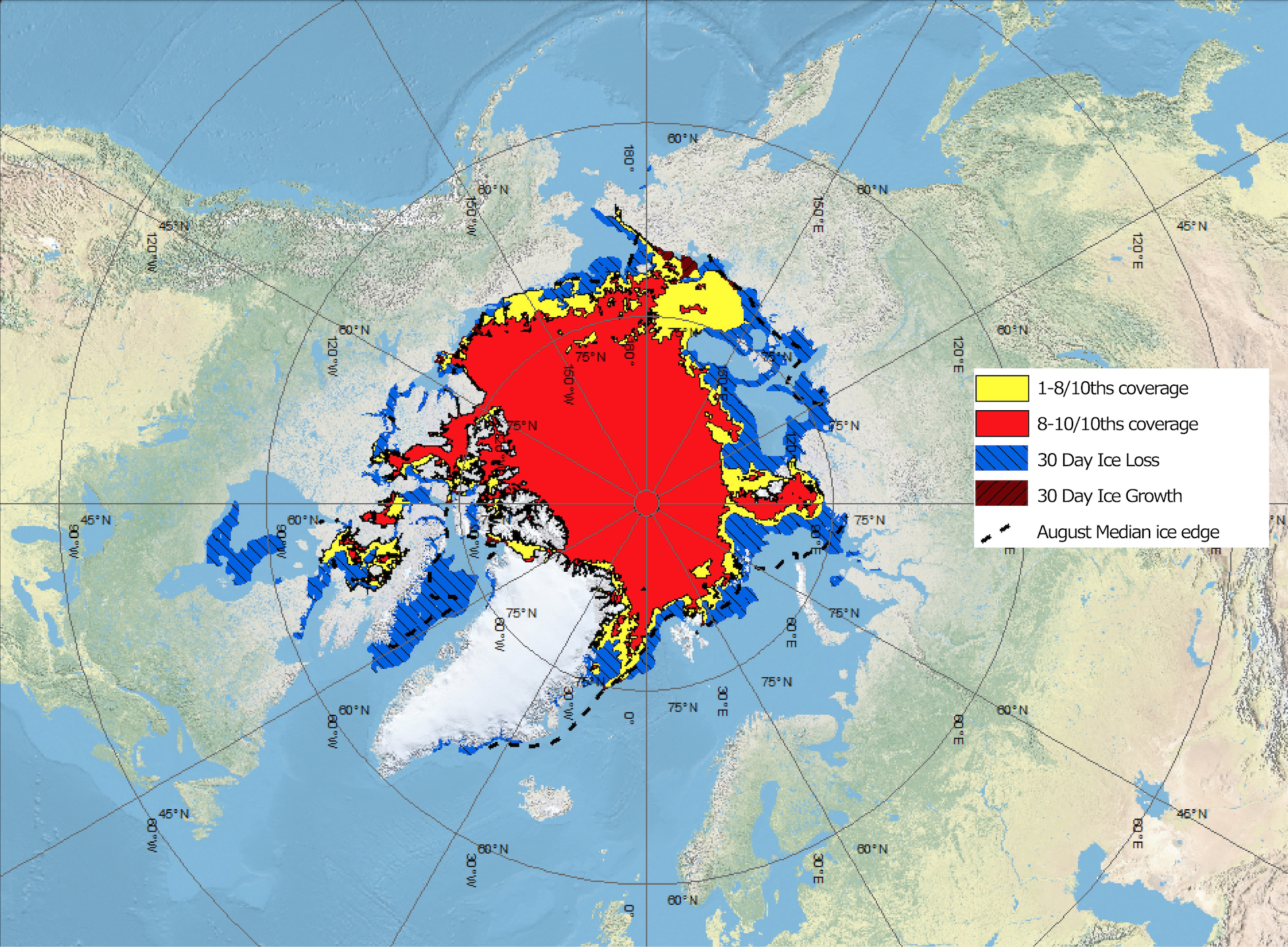 30-day Arctic Ice Extent Change.pngFigure 3. Évolution de l’étendue de la glace de mer en Arctique sur 30 jours, produit par le Centre national des glaces des États‑Unis, le 27 septembre 2021, consulté le 28 septembre 2021 (https://usicecenter.gov/ pub/change30day_n.png).