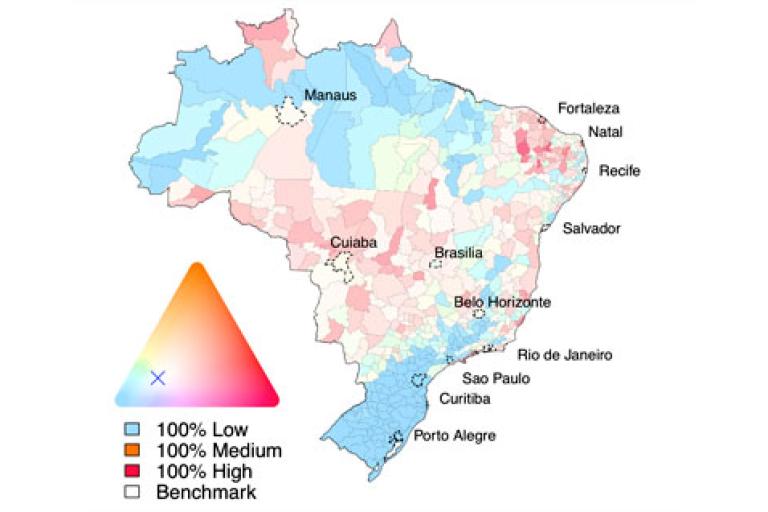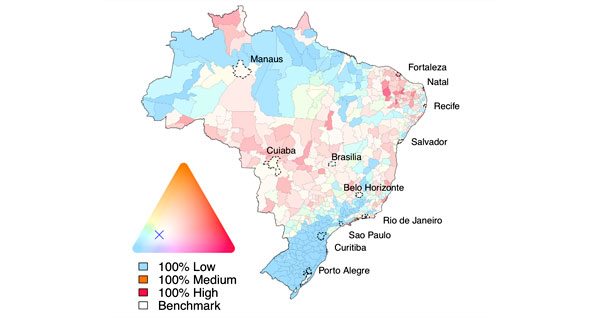 Perspectives probabilistes de l'épidémiologie de la dengue au Brésil, juin 2014: cadre de modélisation pour l'alerte précoce fondé sur la prévision en temps réel des conditions climatiques saisonnières. Les limites des catégories sont définies en fonction du nombre de cas répertoriés – 100 ou 300 – par 100 000 habitants. Le degré de saturation des couleurs correspond au degré de probabilité d'un scénario particulier (Source: Lowe et al., 2014[1])