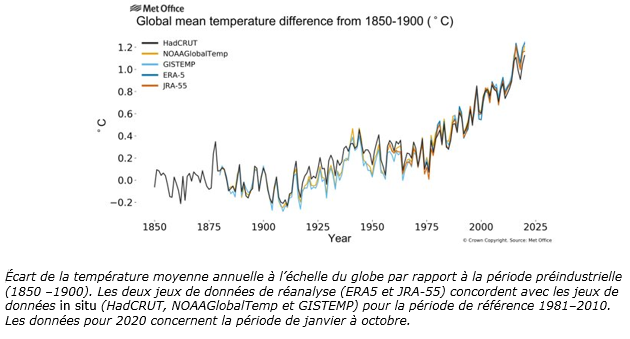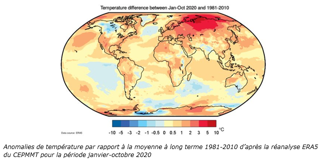 De janvier à octobre 2020, la température moyenne mondiale a été supérieure d’environ 1,2 °C à celle de la période de référence 1850-1900, utilisée comme approximation des niveaux préindustriels. L’année 2020 sera très probablement l’une des trois années les plus chaudes jamais enregistrées sur la planète. C’est en 1850 qu’ont débuté les relevés systématiques de température.