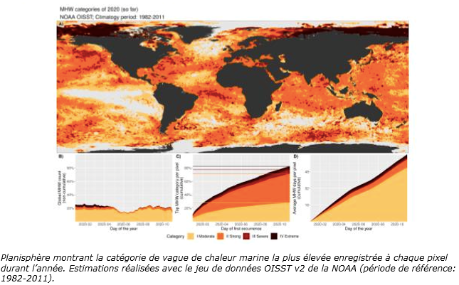 Comme les terres émergées, les eaux océaniques proches de la surface peuvent subir des vagues de chaleur extrêmes qui produisent toute une série d’impacts sur la faune et la flore marines et les communautés qui en sont tributaires. Les données satellitaires sur la température de surface de la mer sont utilisées pour la surveillance des vagues de chaleur marines, lesquelles sont classées en quatre catégories: modérées, fortes, intenses et extrêmes. Une grande partie de la surface océanique a connu au moins une vague de chaleur «forte» à un moment donné en 2020. En mer de Laptev, la vague de chaleur marine a atteint la catégorie «extrême» de juin à octobre. L’étendue des glaces de mer a été exceptionnellement faible dans la région et les zones terrestres adjacentes ont également connu des vagues de chaleur pendant l’été.