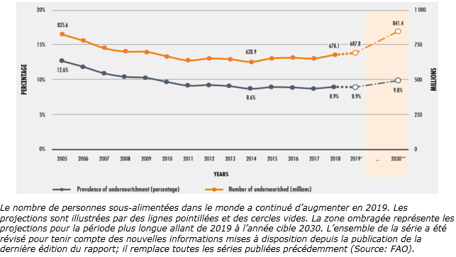 Après des décennies de déclin, la récente augmentation de l’insécurité alimentaire observée depuis 2014 est due aux conflits et au ralentissement économique ainsi qu’à la variabilité du climat et aux phénomènes météorologiques extrêmes. Selon les dernières données de la FAO, en 2019, près de 690 millions de personnes, soit 9 % de la population mondiale, ont été sous‑alimentées et environ 750 millions de personnes ont connu de graves problèmes d’insécurité alimentaire. Le nombre d’individus classés comme étant en situation de crise, d’urgence et de famine a augmenté pour atteindre près de 135 millions dans 55 pays.