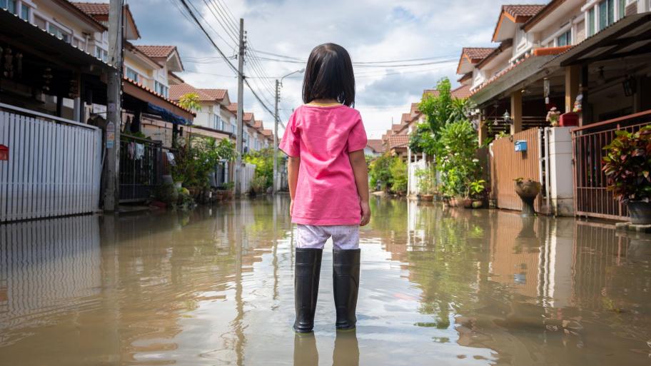 A child in rain boots stands on a flooded street in a residential neighborhood, facing away from the camera.
