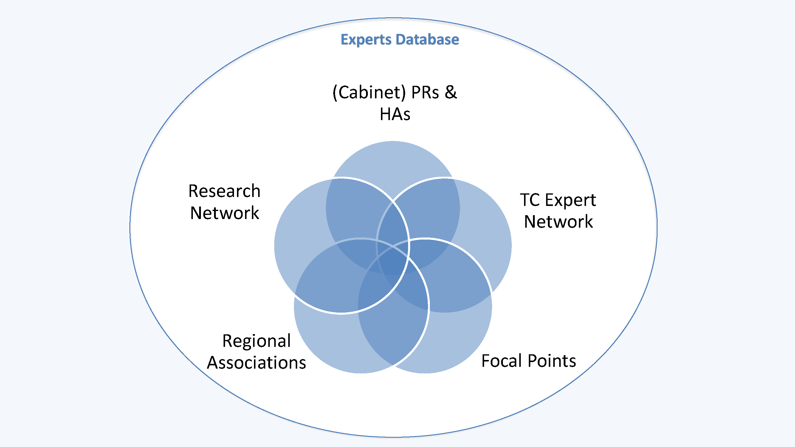 Venn diagram showing overlaps between Research Network, Regional Associations, TC Expert Network, and Focal Points within an Experts Database. (Cabinet) PRs & HAs are central.