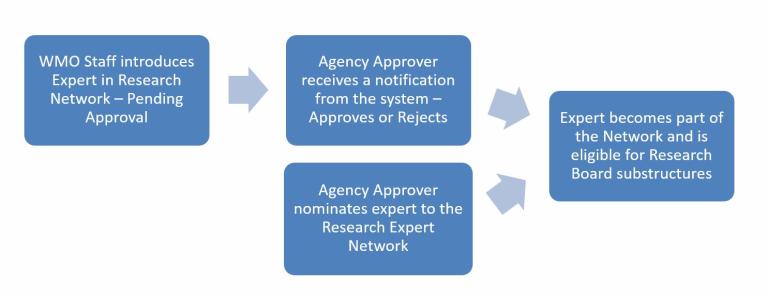 To appoint experts in any of the substructures of the Research Board, the experts must be entered in the Research Expert Network before they can be affiliated to the specific group. In addition to direct nominations by Agency Approvers to the Research Expert Network, experts can also be entered by the Secretariat for approval by the respective Agency Approver to facilitate the inclusion of research experts from the larger community that are not affiliated to a WMO Member or partner. Upon approval by the agency approver the expert becomes available in the research expert network and is eligible for the appointment to serve in sub-groups of the Research Board.