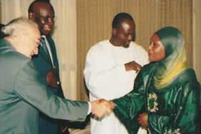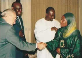 Banjul, The Gambia, October 2008 — Mr Jarraud is greeted by the Secretary of State for Justice, Ms Marie Saine Firdaws. To her right are Mr Ousman Jah, Head of the Social Sciences Department, University of The Gambia, and Mr A. Ndiaye, Director, WMO Regional Office for Africa.
