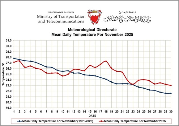 The mean temperature of the month was 25.2°C which is 0.6°C above the long-term normal for November. Note that the highest mean monthly temperature for November was 27.4°C recorded in 2022.
