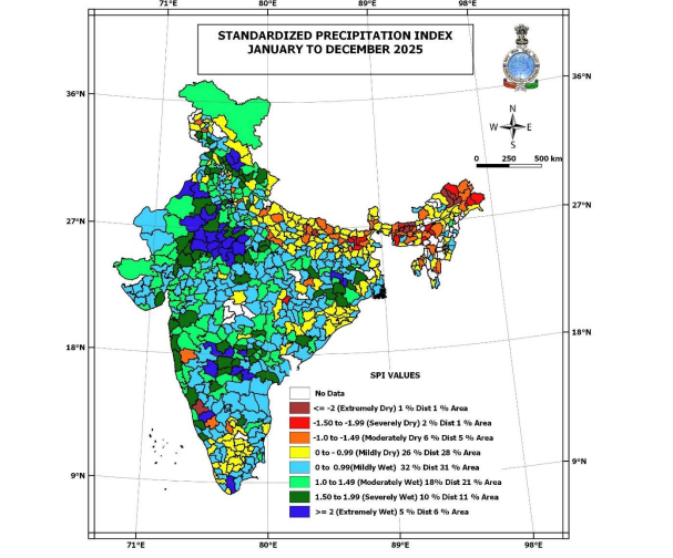 The 2025 annual rainfall over the country as a whole was(1274 mm) 110% of the Long Period Average (LPA) for the period of 1971–2020. Seasonally, winter rainfall was below normal (52% of its LPA), while rainfall during all the other three seasons were above normal with the pre-monsoon, southwest monsoon and post monsoon seasons recorded rainfall of 142% 108% and 111% of LPA respectively.
