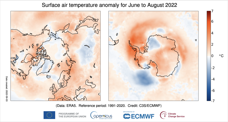 Globally it was the joint third warmest August on record (similar to the values for August 2017 and 2021 and within about 0.1°C of the higher values reached in August 2016 and 2019), according to Copernicus Climate Change Service.