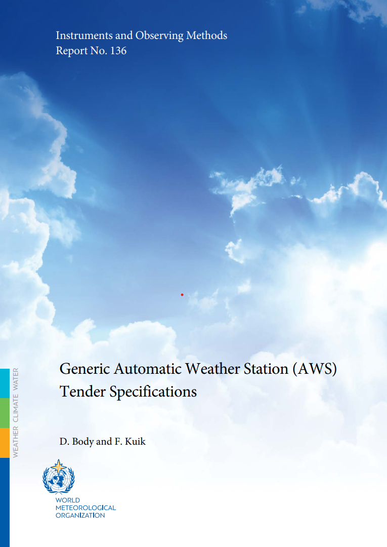 Generic Automatic Weather Station (AWS) Tender Specifications is a set of documents intended to support the tendering process for AWSs. It aims at guiding NMHS and other stakeholders to ensure their requirements align with international best practice, and helping equipment vendors to provide required instrument specifications. Generic AWS Tender Specifications are based on WMO guidance documentation and are neutral with respect to manufacturers. They can be used as a base for tendering processes and amended as needed to fit needs and tendering process regulations.