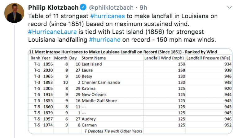 Laura made landfall in with maximum sustained winds of 150 mph (241 km/h). In terms of wind speed, it was the strongest storm (tied) to hit Louisiana