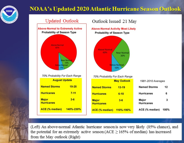 NOAA’s updated hurricane season outlook issued on 6 August indicates that an above-normal hurricane season is very likely, and there is an increased possibility of the season being extremely active, with 19-25 named storms, including 7-11 hurricanes and 3-6 major hurricanes (category 3 and above). This is because of conducive atmospheric and oceanic conditions in the part of the Atlantic where tropical storms develop, such as well above average sea surface temperatures, weaker trade winds, weaker windshear and a strong west African monsoon.