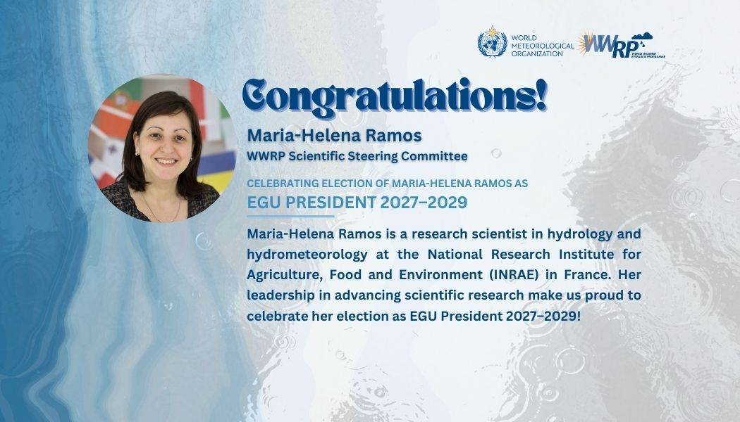We are delighted to announce that Maria-Helena Ramos has been elected President of the European Geosciences Union (EGU) for the 2027–2029 term. A respected member of the WWRP Scientific Steering Committee, Maria-Helena has made significant contributions to advancing collaborative research and scientific innovation across disciplines.