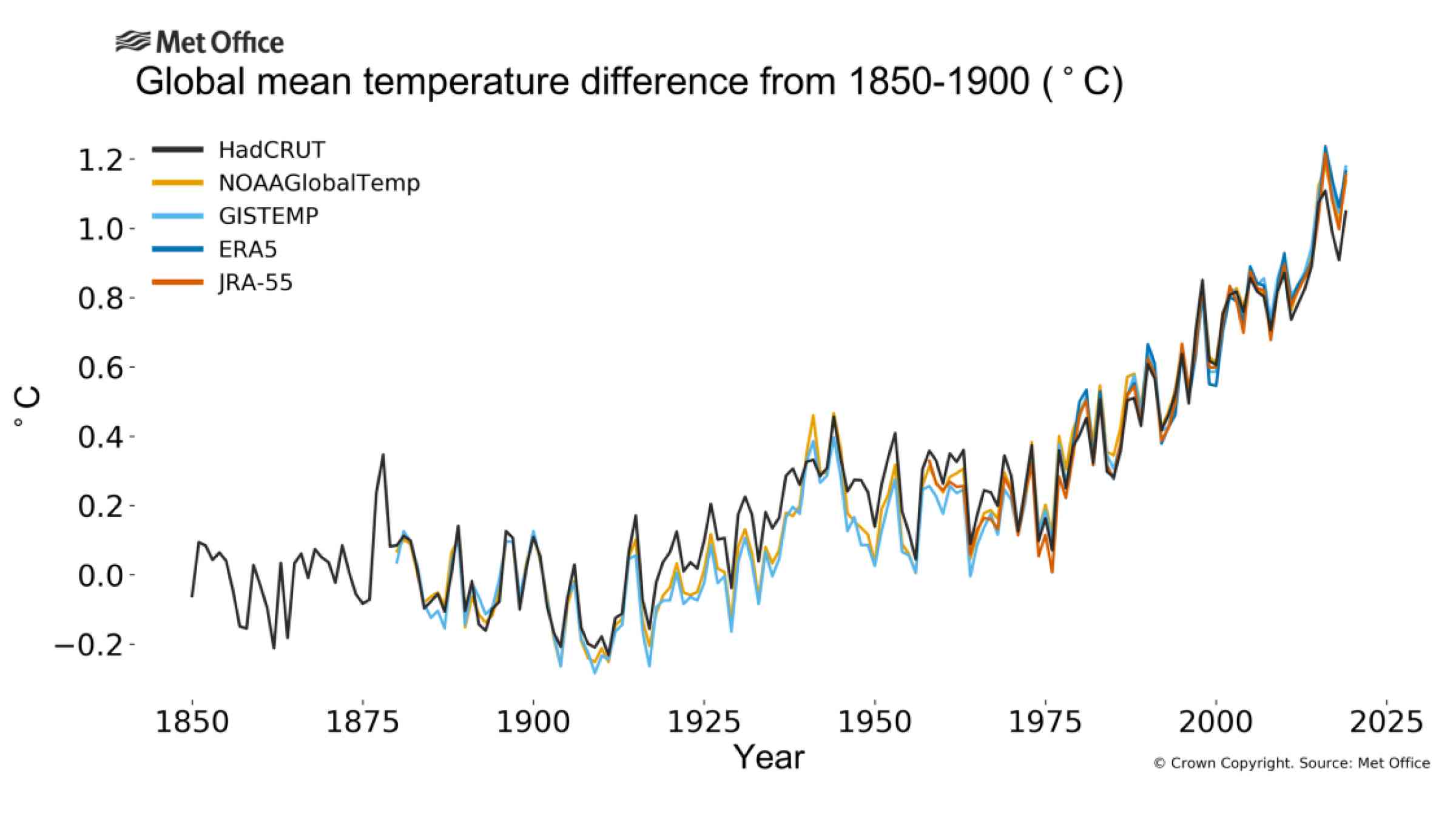 2019 ended with a global average temperature of 1.1°C above estimated pre-industrial levels, second only to the record set in 2016, when a very strong El Niño event contributed to an increased global mean temperature atop the overall warming trend.