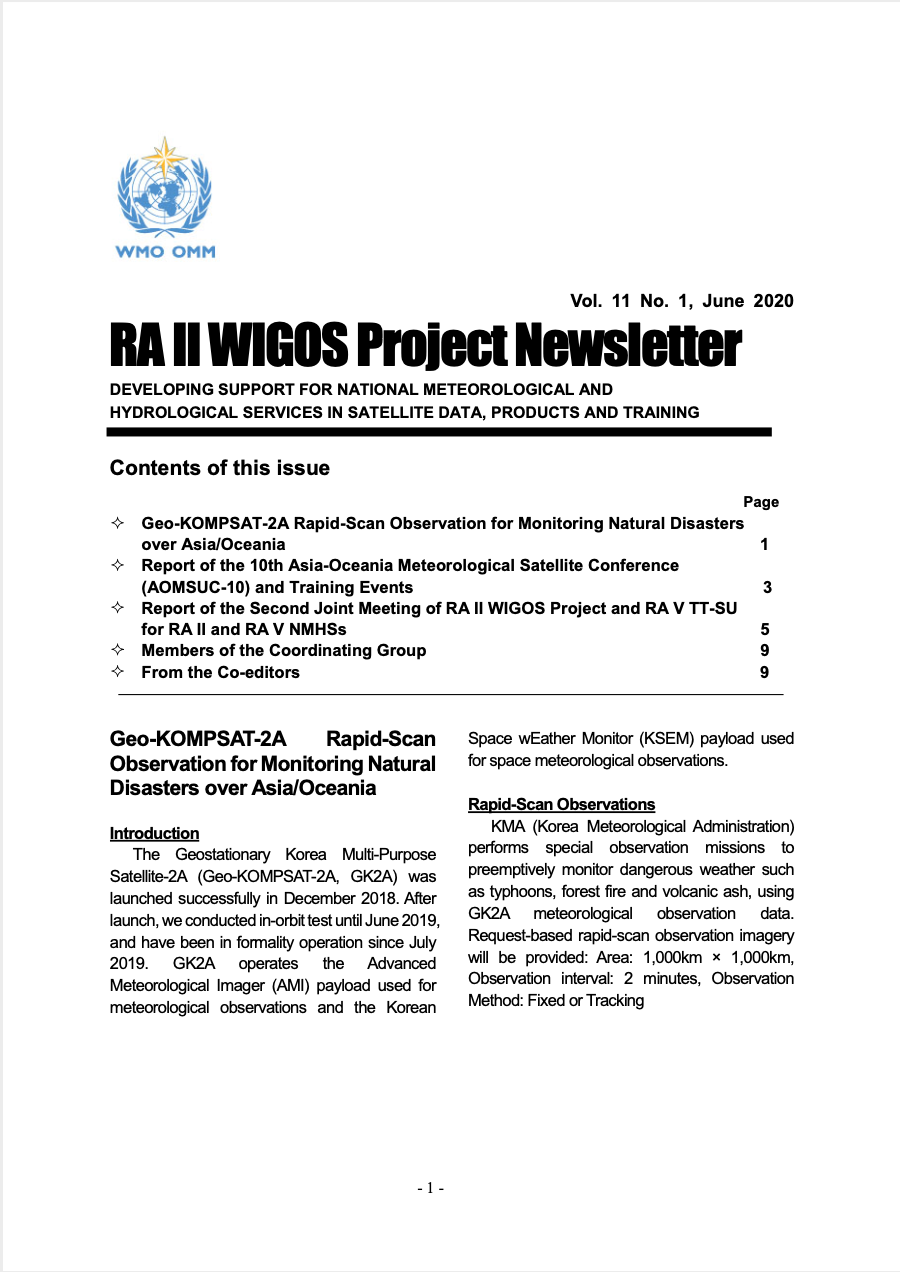 The RA II WIGOS Project Newsletter Vol. 11 No. 1, June 2020, is now available from http://www.jma.go.jp/jma/jma-eng/satellite/ra2wigosproject/ra2wigosnewsletter.html.