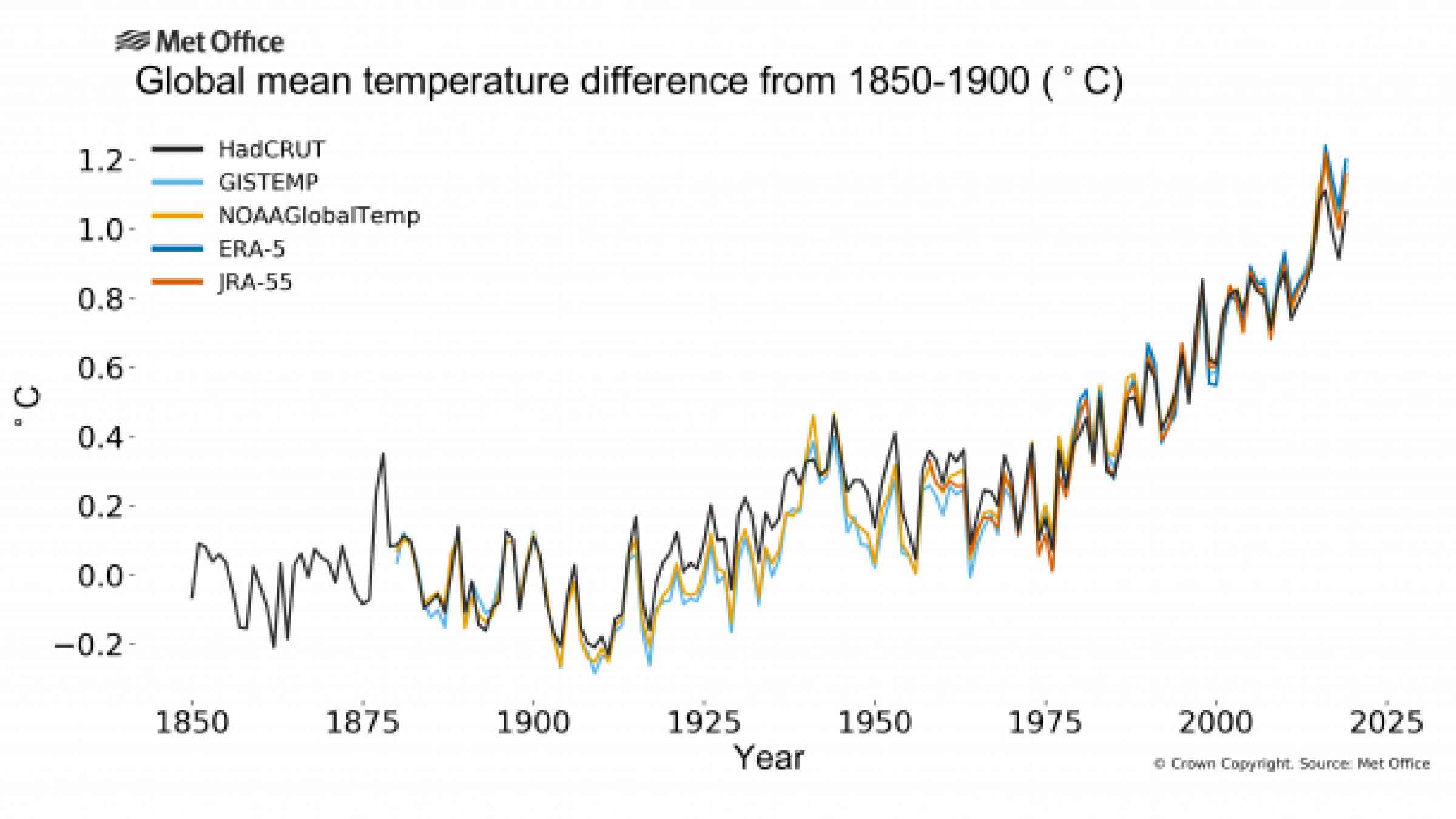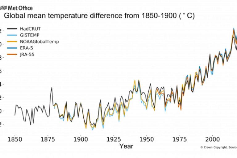 The spread between the five data sets was 0.15°C with both the lowest (1.05°C) and the highest (1.20°C) being more than 1°C warmer than the pre-industrial baseline.