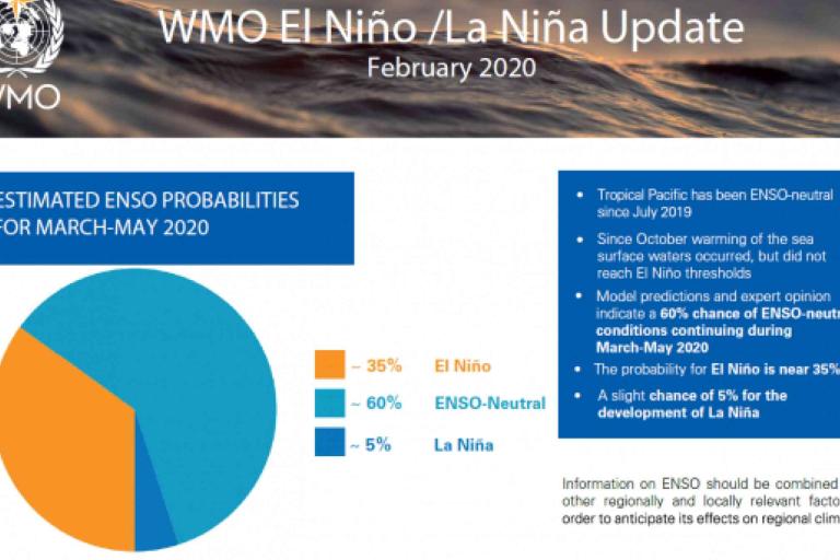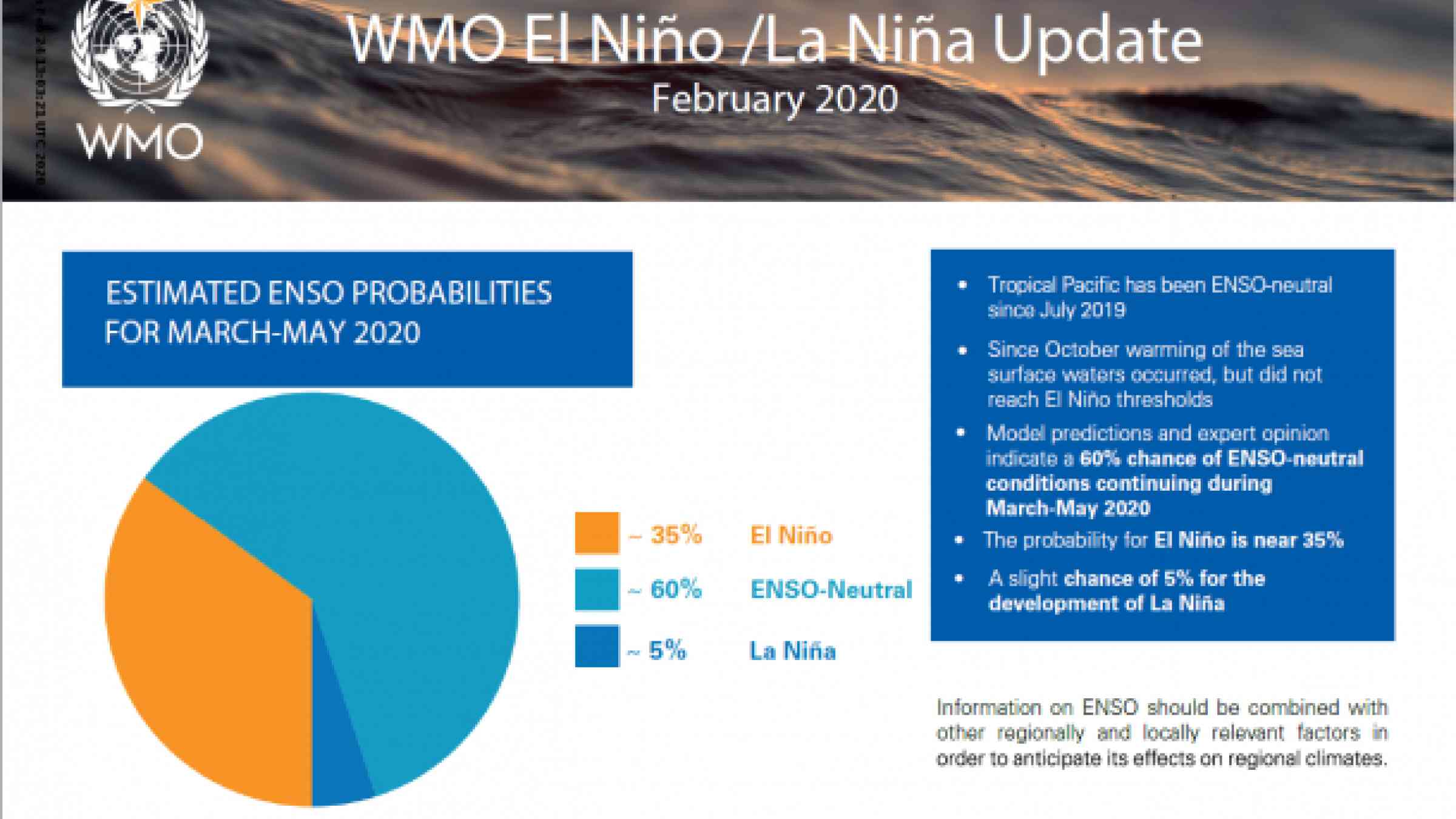 WMO’s El Niño/Southern Oscillation (ENSO) Update said that there is a 60% chance of ongoing ENSO-neutral conditions continuing during March-May 2020. The chances for an El Niño or La Niña are 35% and 5% respectively. For the June-August 2020 season, the chance for ENSO-neutral is 55%, that for El Niño is 20-25% and that for La Niña is also 20-25%.