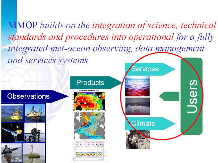 The purpose of MMOP is to assist Members to provide data, information, services in support of the safety of life and property at sea, operations in the open and coastal ocean areas, including ice-covered regions, the protection and sustainable development of the ocean and marine environment, Numerical Weather Prediction (NWP) and operational meteorology, the monitoring and prediction of seasonal-to-inter-annual climate variability and climate change, and the efficient management of marine resources, based on the collection and integrated management of marine meteorological and oceanographic data.  The Programme also aims to strengthen Members’ capacities (in particular Least Developed Countries - LDCs) to achieve the objectives of MMOP, mainly by developing specific projects and training to these regions regarding their needs.  The programme will continue to contribute to an appropriate infrastructure for technological innovation, information exchange, national capacity-building and manpower development in the specialized areas of marine meteorology and oceanography.  The programme is developed with best scientific practice, design, management, implementation, and monitoring of observing systems, data management practices, and promotes innovative organizational structures of an international, global and regional nature; the programme will therefore contribute to the implementation of practically all WMO strategies.