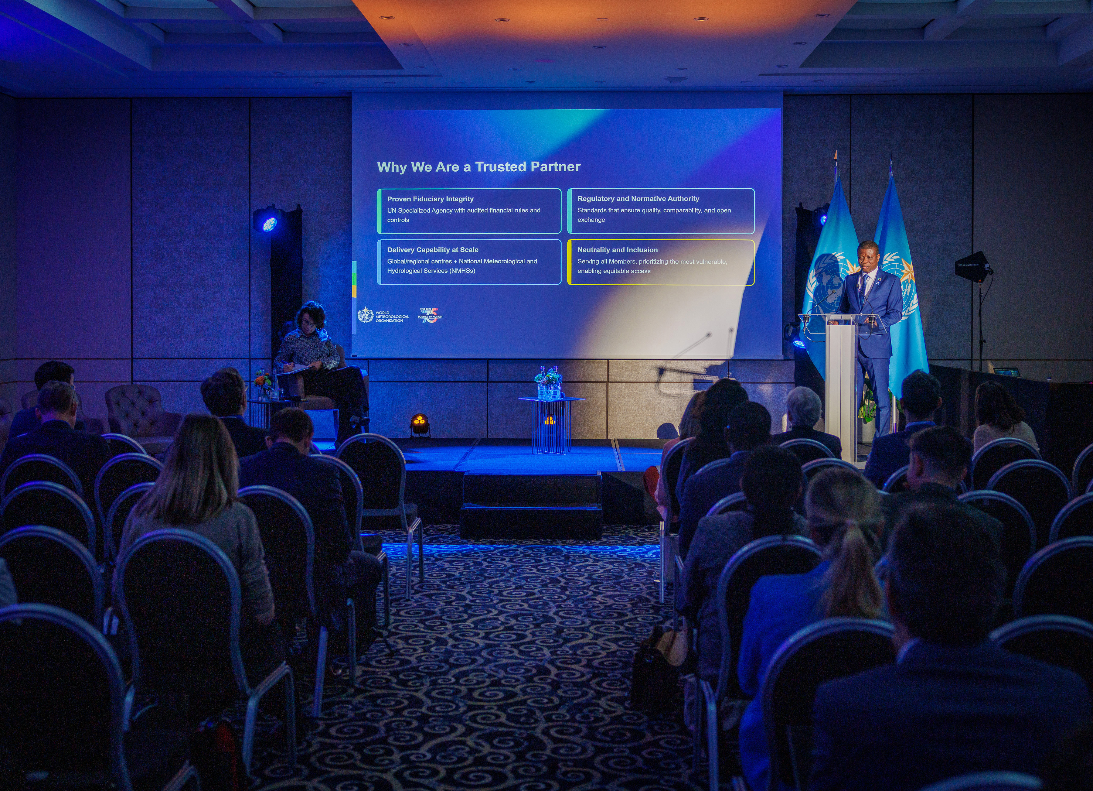 A woman stands at a podium speaking, with two blue flags displaying a world map emblem behind her, and an audience seated in the foreground.