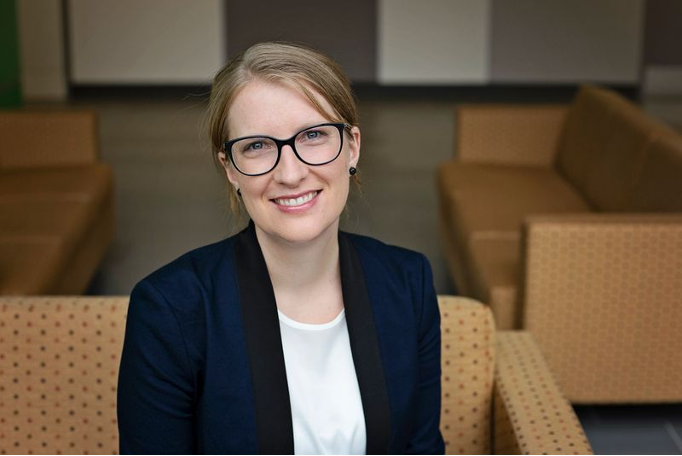 A person wearing glasses and a blazer sits on a patterned sofa, smiling at the camera in a lounge area with more sofas in the background.