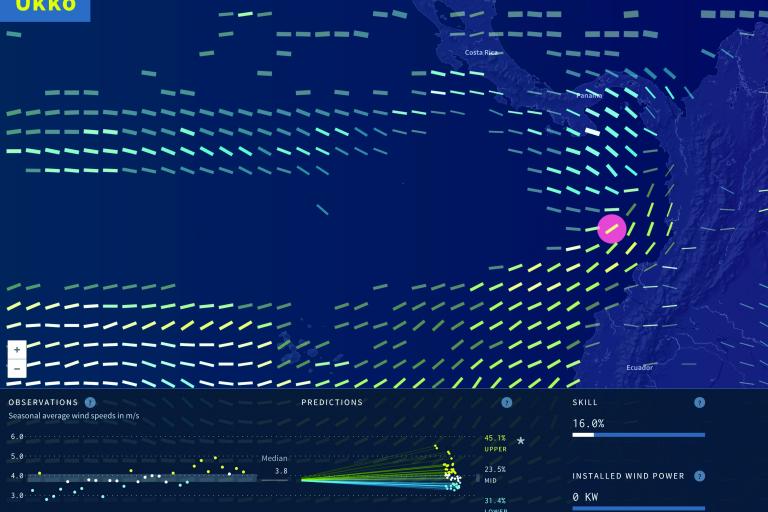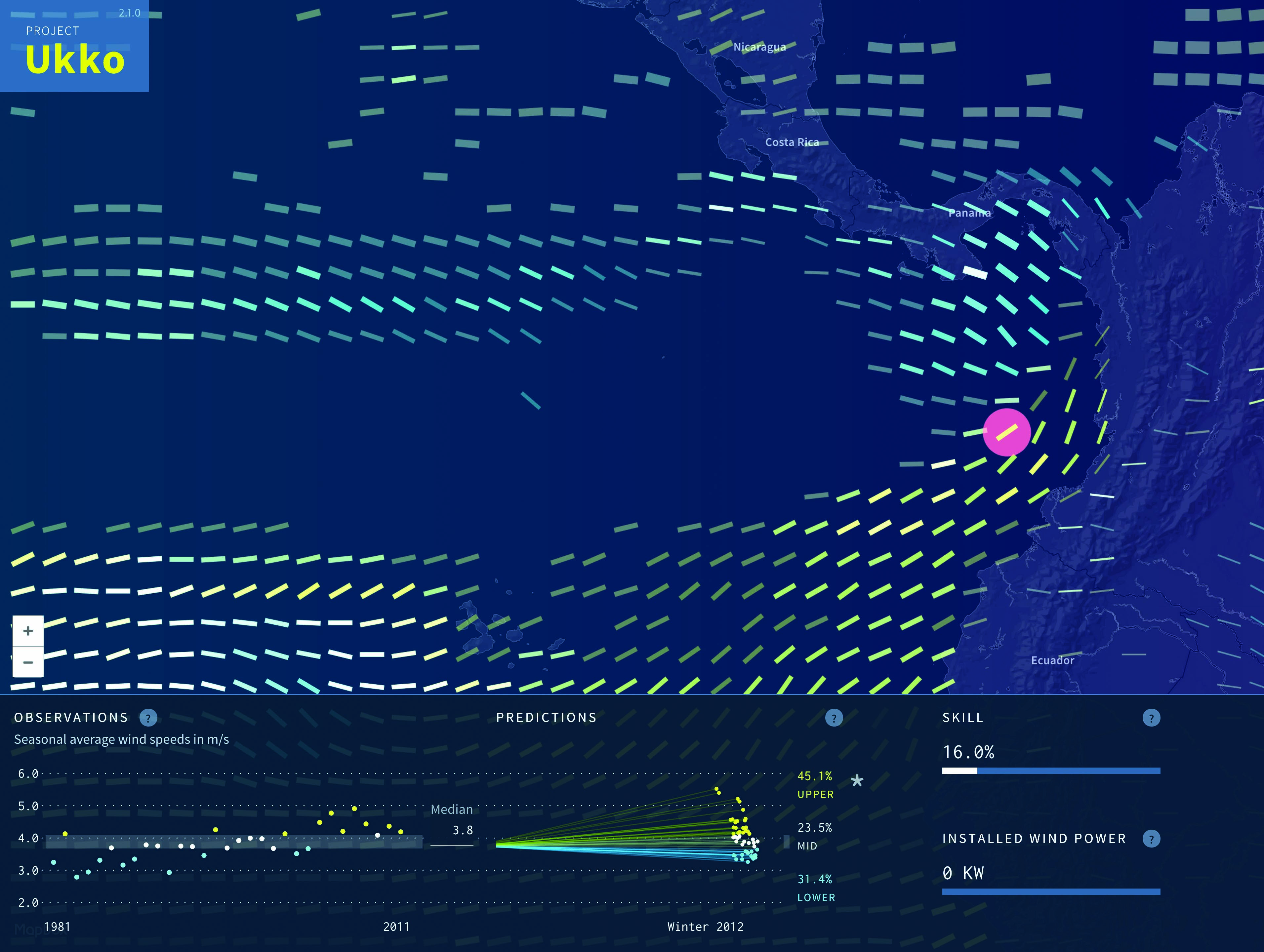 Не меньше внимания было уделено научным аспектам адаптации последующей обработки и калибровки данных к потребностям энергетического сектора и графическому представлению вероятностных прогнозов в формате, который понятен и привлекателен для пользователей. Прототип предназначен для двух основных групп пользователей: торговцев энергией, которые в своих операциях не ограничиваются рамками прогнозов с расширенным сроком, и операторов ветровых электростанций, которые хотят оценить ожидаемую прибыль на инвестиции и спланировать работы по техническому обслуживанию в периоды, когда затраты и потеря доходов минимизированы. Наиболее ощутимым результатом является проект UKKO, т. е. карта мира с наложением данных, предназначенная для того, чтобы дать возможность пользователям быстро обнаружить закономерности и тренды будущего состояния ветра и на их основе перейти к подробному распределению прогнозов на региональном уровне. UKKO – это совместный проект инновационной лаборатории «Future Everything», компании BSC и Метеорологического бюро, выполняемый в рамках EUPORIAS.