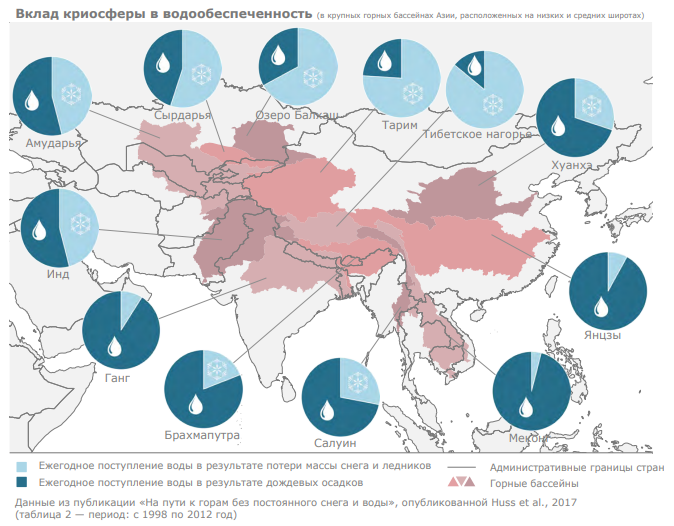 Поскольку все крупные реки берут начало в горах, их часто называют «водонапорными башнями мира» (Immerzeel et al., 2020). Горная криосфера — ледники, снег, многолетняя мерзлота и сезонномёрзлый грунт — играет основополагающую роль в обеспечении и регулировании ресурсов пресной воды для примерно половины населения Земли (Egan and Price, 2017). К этой половине, в частности, относятся жители густонаселённых низменных районов, таких как дельта Ганга и Брахмапутры.