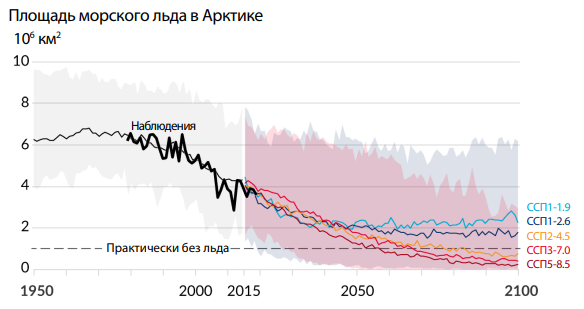 Рисунок 5. Площадь арктического морского льда в сентябре составила 106 км2 по данным спутниковых наблюдений и результатов ПССМ6. Весьма вероятные диапазоны показаны для ССП1-2.6 и ССП3-7.0. Предполагается, что Арктика станет практически свободной ото льда около середины столетия по сценариям средних и высоких уровней выбросов ПГ. В основе данного рисунка — рисунок РП.8 в МГЭИК (2021). (Наблюдения добавлены проф. Эдом Хокинсом (http://www.climate-lab-book.ac.uk/2021/adding-observations/) (Материал любезно предоставлен Томасом Лавернье) |