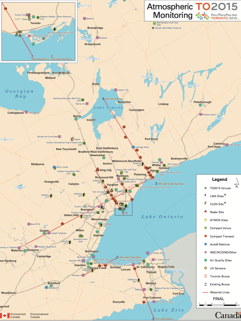 Игры в Торонто дали возможность Министерству по проблемам окружающей среды и изменению климата Канады испытать новейшие стратегии мониторинга, прогностические модели, методы прогноза, процессы сбора данных и приложения для распределения данных.