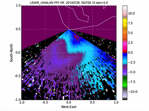 Радиальная скорость, измеренная допплеровским лидаром, показывает резкие сдвиги ветра на высотах над поверхностью земли, - СЗ на высоте 14 м, ЮЗ на высоте 42 м и ЮЮЗ на высоте 56 м, - отмечающие прохождение озерного бриза (справа).