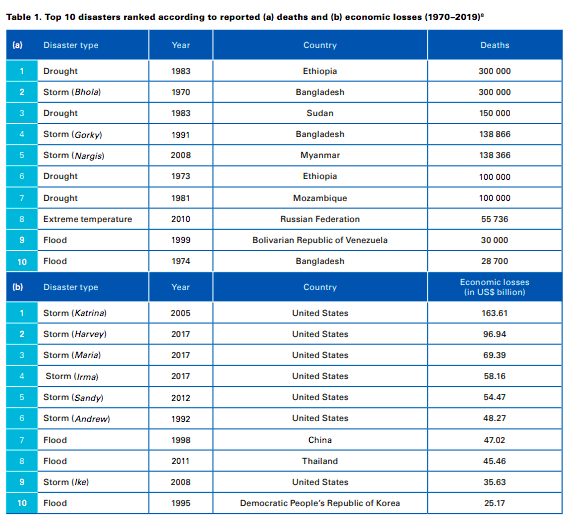 Из десяти бедствий в верхней части списка к наибольшим человеческим жертвам за этот период приводили в том числе такие опасные явления, как засухи (650 000 смертей), штормы (577 232 смерти), паводки (58 700 смертей) и экстремальные температуры (55 736 смертей).