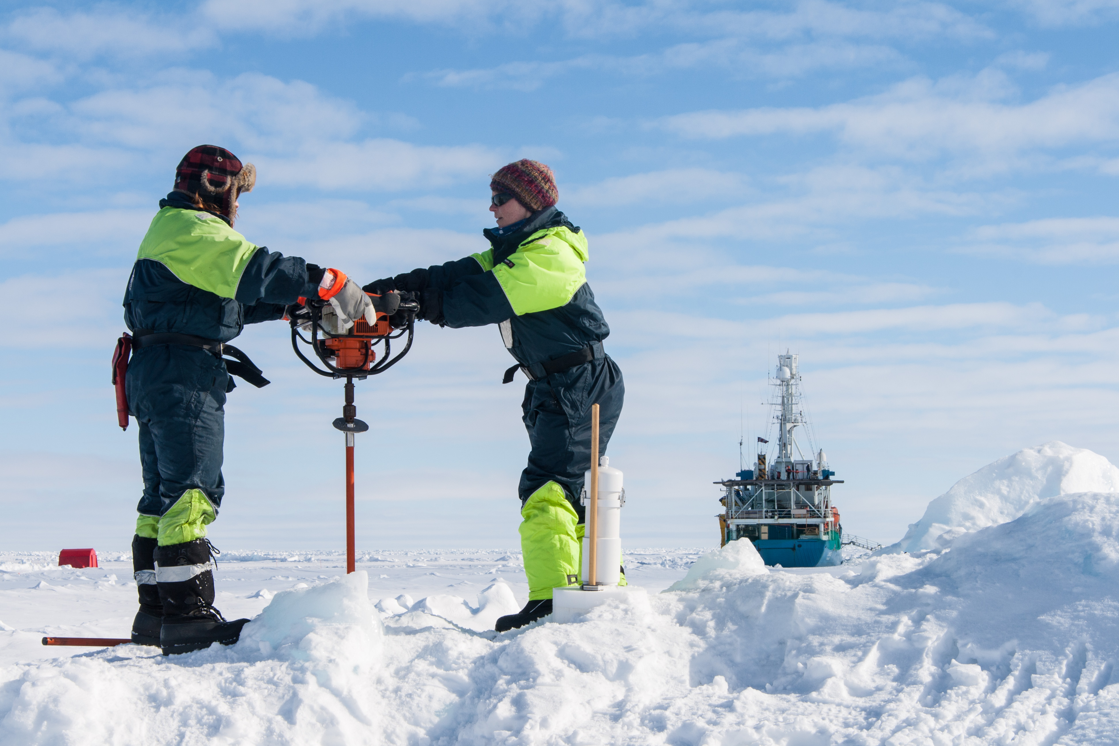 Two people in winter gear operate an ice drill on a snowy landscape with a research vessel and equipment visible in the background under a partly cloudy sky.