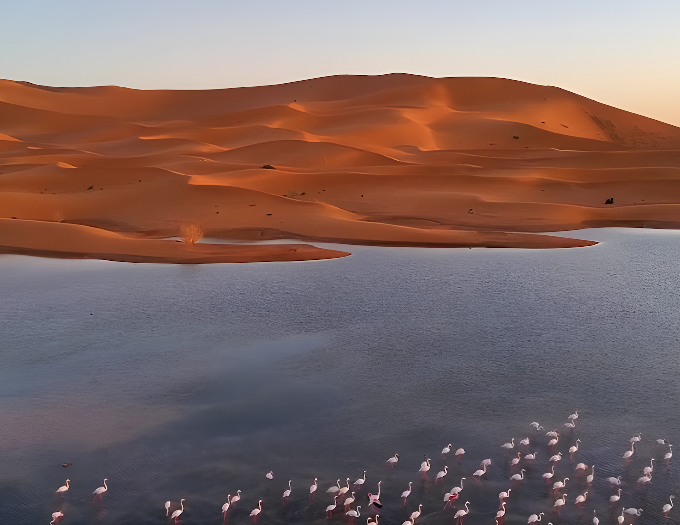 A group of flamingos stands in shallow water with large, orange sand dunes in the background under a clear sky.