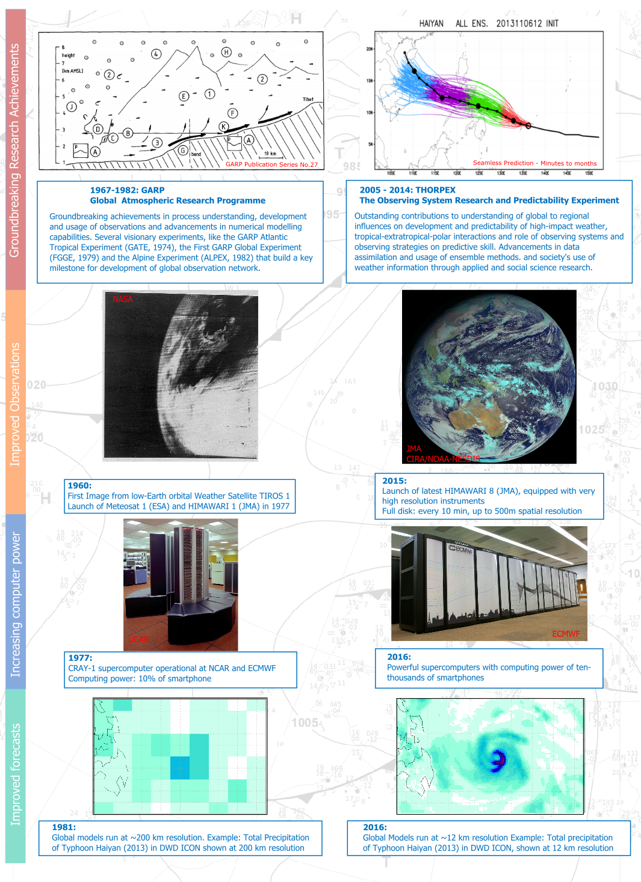 In 2003, WMO established an international atmospheric research and development programme, The Observing system Research and Predictability Experiment – THORPEX (Parsons et al. 2016). As a major 10-year programme, THORPEX built upon the highly successful 15-year Global Atmospheric Research Programme (GARP) initiated in 1967. While GARP focused on clarifying critical but poorly understood aspects of atmospheric dynamics, which eventually led to significant improvements in the accuracy of weather forecasts, the primary goal of THORPEX was “Accelerating improvements in the accuracy of 1-day to 2-week high-impact weather forecasts for the benefit of society, the economy and the environment”. THORPEX provided the essential framework for strong international collaborations in research into dynamics, predictability, and data assimilation, in major field experiments, in the exploitation of observation technologies and the development and use of ensemble prediction techniques. THORPEX fostered increased cooperation between the academic research community and National Meteorological and Hydrological Services (NMHS). Major achievements of THORPEX include addressing the potential of targeted observations through field campaigns, improved understanding of dynamical processes, developing and evaluating new data assimilation techniques and increasing the value of large multi-model ensemble prediction systems through the THORPEX Interactive Grand Global Ensemble (TIGGE) database. Progress has also been made in facilitating the development and application of new and improved verification methods to assess and enable improvement of the quality of weather forecasts, and in the provision of nowcasting information and mesoscale predictions.